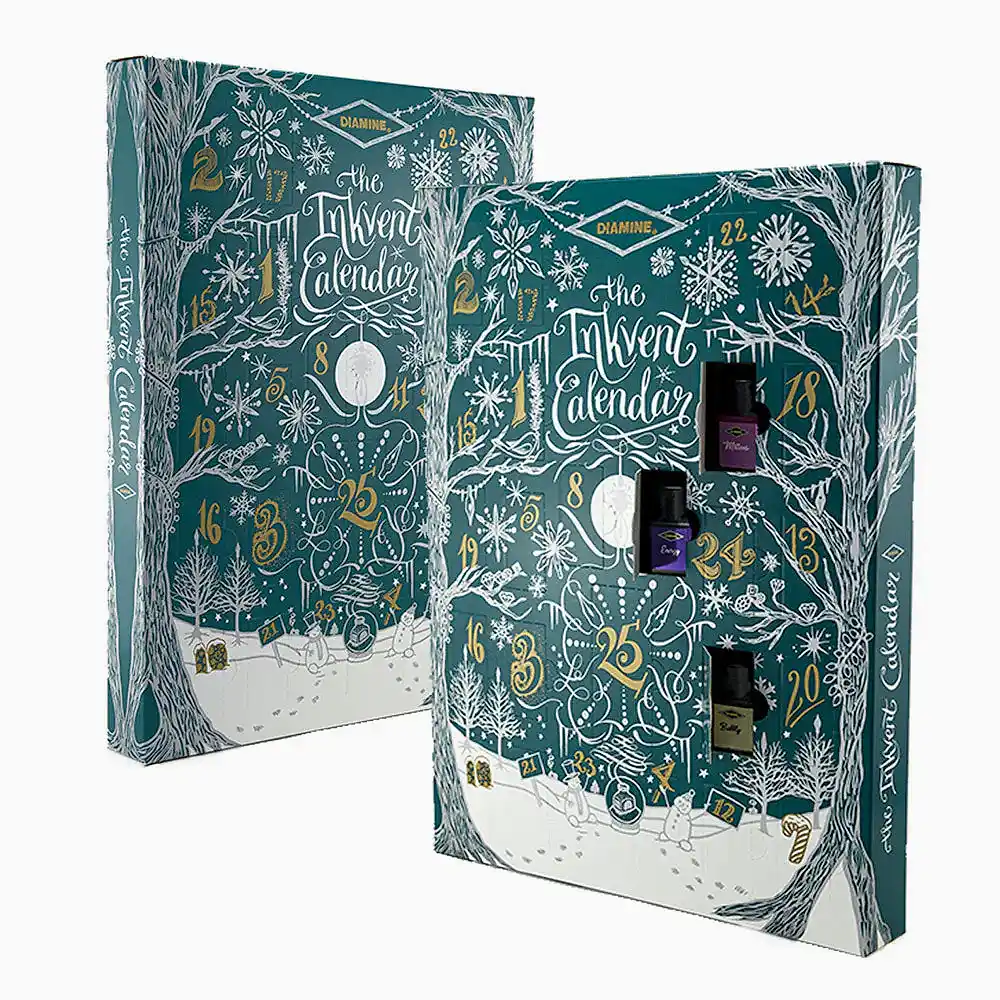 Inkvent Calender içerisinde. Standard, Sheen, Extreme Sheen, Shimmer, Shimmer & Sheen, Chameleon, Pigment, Pigment Shimmer, Pigment Chameleon, ve Kokulu mürekkep yer almaktadır.