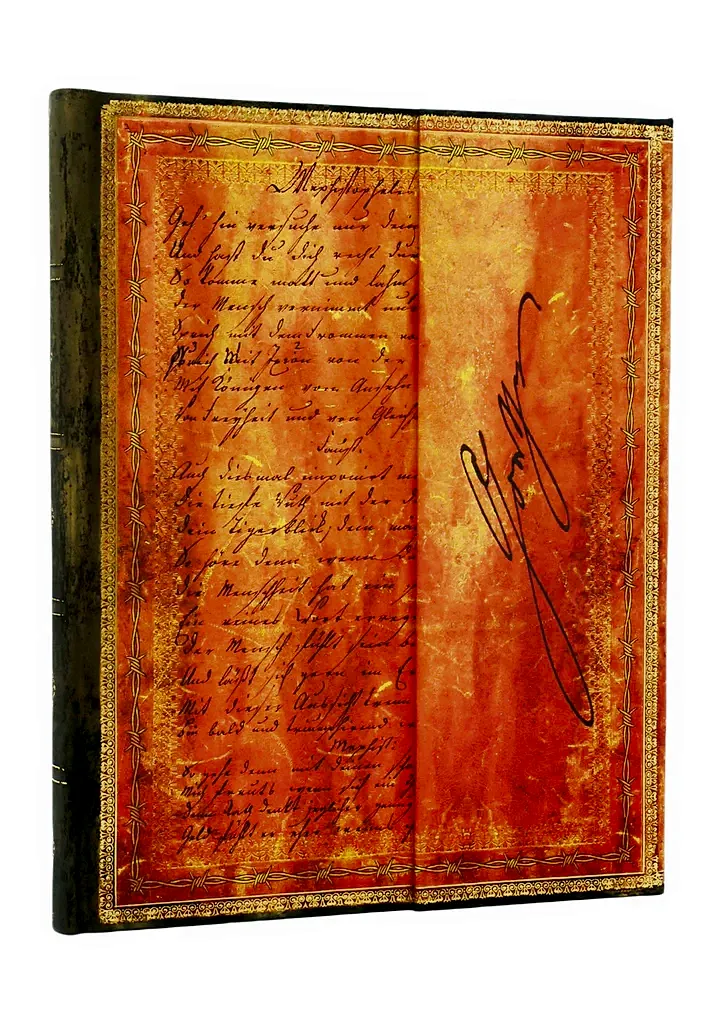 Burada, Goethe'nin Faust II elyazmasından Faust ve Mefistofeles arasında el yazısıyla yazılmış bir diyalog yer alıyor ve arka kapakta, iki karakterin Alman illüstratör ve çizer Julius Nisle tarafından yapılmış bir gravürü yer alıyor. Goethe, Süslemeli Elyazmaları Koleksiyonumuza yabancı değil ve üç ayrı yayında yer aldı: iki yıllık İtalya yolculuğunda tuttuğu seyahat günlüğünden bir alıntı, arkadaşı Friedrich von Schiller tarafından kendisine yazılan bir mektup ve Goethe'nin Erlkönig şiirinin Franz Schubert tarafından uyarlanan müzikal uyarlamasının bir reprodüksiyonu. 19. yüzyılın en aktif ve yetenekli beyinlerinden biri olan Goethe'yi Paperblanks koleksiyonumuza geri döndürmekten mutluluk duyuyoruz.